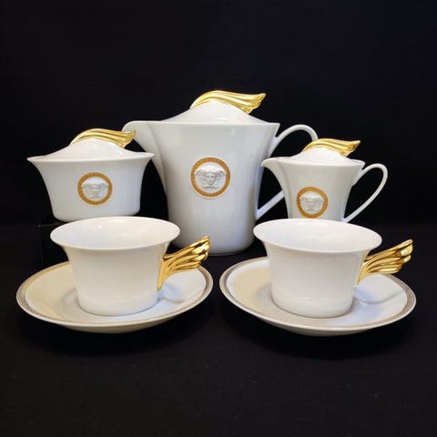 Fra mine forældres efterladenskaber kommer her et kaffeservice fra Rosenthal til auktion. Dekoren er fra Versace "Les Trésors de la Mer" og formen er Ikarus af Paul Wunderlich. Kaffeservicen er delvist bladgulleret i dekoren.