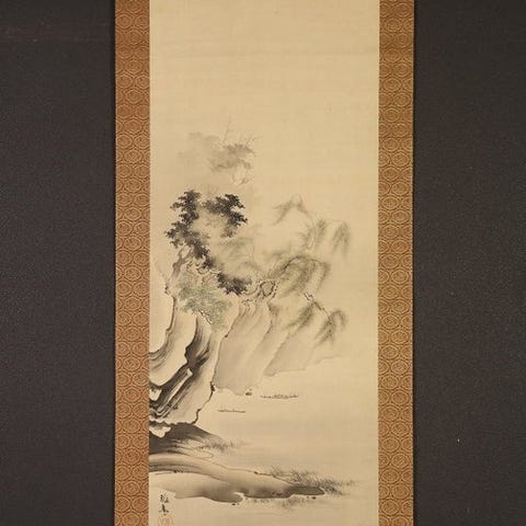 En stor seks-panel Byōbu fra Meiji-perioden med landskabsbillede ved en sø, malet med blæk på gyldensandspapir, måler 186 cm i højden og 377,5 cm i bredden, med silke kanter, lakeret træramme og certifikat for ægthed fra Mastromauro Japanese art gallery. Klik på den blå "gå til varen" knap, for at købe eller byde på denne vare. Den samlede pris vil blive vist inden du afgiver dit bud.