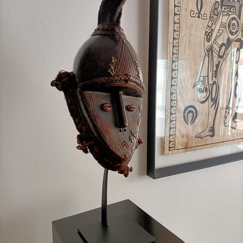 Træmaske med titlen “Máscara guro” fra Guro-kulturen i Elfenbenskysten, fra slutningen af det 20. århundrede, provenance privat samling, højde 35 cm, i god stand. Klik på den blå "gå til varen" knap, for at købe eller byde på denne vare. Den samlede pris vil blive vist inden du afgiver dit bud.