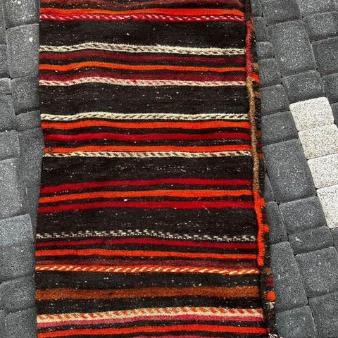 Oprindelsesland Tyrkiet, Bergama-model håndvævet Kilim af uld på uld, 132 × 65 cm, professionelt renset og i god vintage stand med tegn på slid. Klik på den blå "gå til varen" knap, for at købe eller byde på denne vare. Den samlede pris vil blive vist inden du afgiver dit bud.