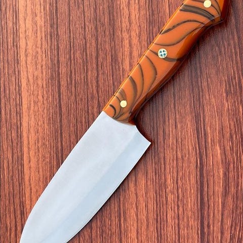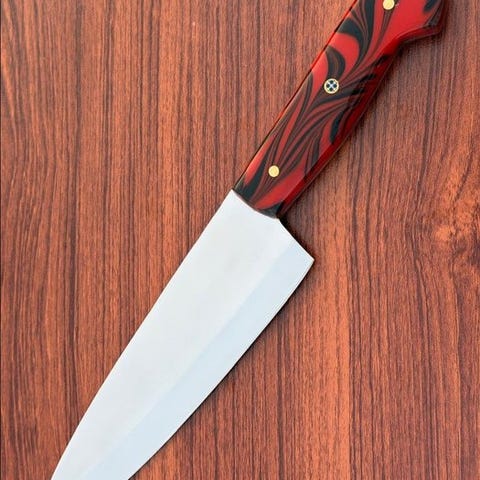 Håndtaget præsenterer et iøjnefaldende rødt og sort marmoreret design, fremstillet for både visuel appel og ergonomisk komfort. Fastgjort med polerede messingstænger, håndtaget giver et solidt, afbalanceret greb der reducerer håndtræthed ved lang tids brug. Kombinerer funktionalitet med dristig stil, er denne kniv en pålidelig og iøjnefaldende tilføjelse