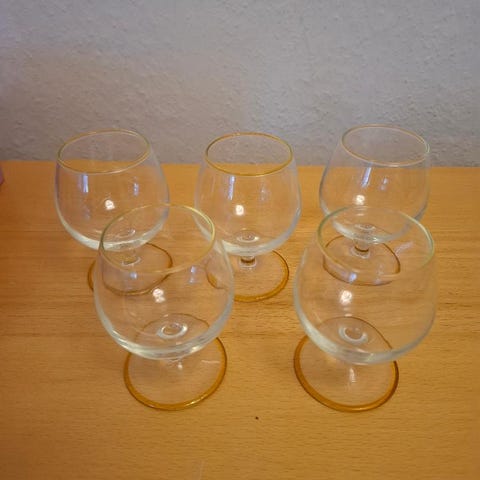Glas, 4 cognac glas og karaffel, og 4 rødvinsglas på sort fod