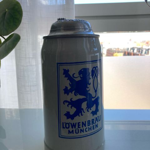 Gammelt ølkrus med indgraveret metalhældning, neogotisk stil, 1800-tallet.