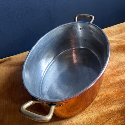 De angivne dimensioner er for den mindre gryde. Låget har en diameter på 20 cm og er uden tinbelægning. Den ovale gryde med låg har en højde på 12,0 centimeter, en længde på 30,0 centimeter og en bredde på 22,0 centimeter. Kan købes som vist og foretrukket.