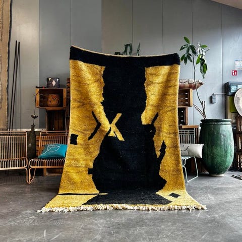 Denne ekstraordinære vintage-moroccanske Boujad-tæppe er et ægte eksempel på berberhåndværk, håndvævet i Marokko af naturligt uld. Boujad-tæpper er kendt for deres udtryksfulde mønstre, rige farver og symbolske motiver, hvilket gør hvert stykke til en ægte tekstilkunst.