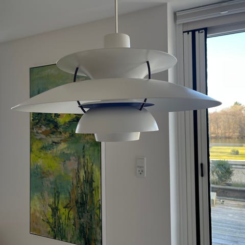 Louis Poulsen PH pendel designet af Poul Henningsen. Loftlampen har skærmsystem i flere lag med øverste skærm i messing og underliggende skærme i hvidt materiale, der giver et blændfrit og jævnt lys. Velegnet som belysning over spisebord, køkkenbord eller i opholdsrum.