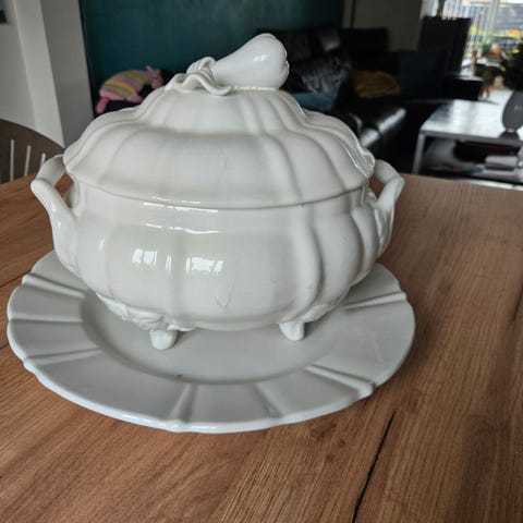 Et komplet og dekorativt serveringssæt – velegnet både til brug og som stemningsfuld dekoration i sommerhus, landlig eller klassisk indretning.