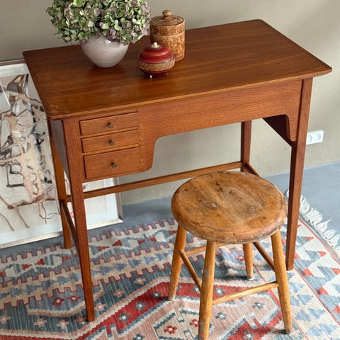 Skrivebord fineret med teak med nyreformet plade, front med fire skuffer samt fint buet låge, bag hvilken drejelig barindretning med spejl, samt drejbart barskab.