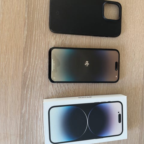 Apple iPhone 14 Pro Max smartphone med 256 GB intern hukommelse. Modellen har stor skærm med frontkamera i skærmen og tredobbelt bagkamera. Leveres med original æske som vist på billederne.