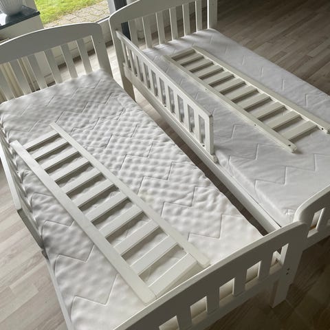 BabyDan juniorseng i hvid. Sengen har faste sengeheste på siderne med udskårne greb og en åbning i den ene side for nem ind- og udstigning. Den står på fire ben og er egnet til mindre børn, der er vokset ud af tremmesengen. Madrassen på billederne viser sengens liggeflade. Sengen leveres med brugervejledning, som viser samling og montering af sengens dele.