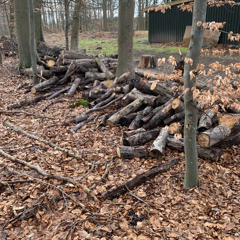 Brænde af blandet løvtræ, kløvede og afkortet i passende længder til brændeovn eller pejs 25-30 cm.