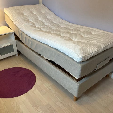 Jysk elevationssenge i grå betræk. Sengene består af to separate sengebunde med lameller og elektrisk elevation, som kan justeres i hoved- og fodende. Elevationen styres via medfølgende fjernbetjeninger. Velegnet som dobbeltseng eller to enkeltsenge afhængigt af opstilling. Madrasser og øvrigt tilbehør følger kun med, hvis det er angivet andetsteds i annoncen. Sengene er udelukkende brugt med topmadrasser på.
