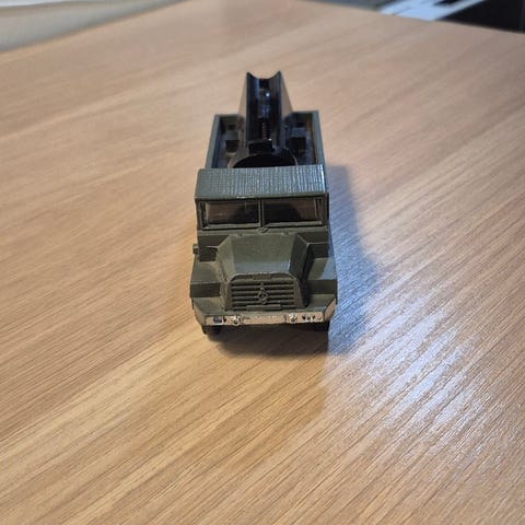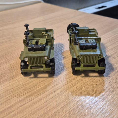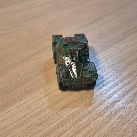 Jeg sælger en original vintagemodel af militærkøretøjet Austin Champ, katalognummer 674, fra den berømte britiske producent Dinky Toys (Meccano). Modellen stammer fra 1950'erne/60'erne.