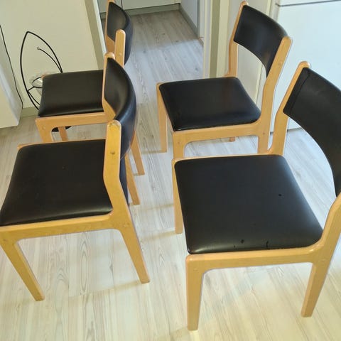 Jeg sælger disse seks flotte Findahl (Mosbøl) spisebordsstole i teaktræ og bøg med sæde af skai (kunstlæder). De fremstår i flot stand med forventeligt aldersrelateret slid. 😊