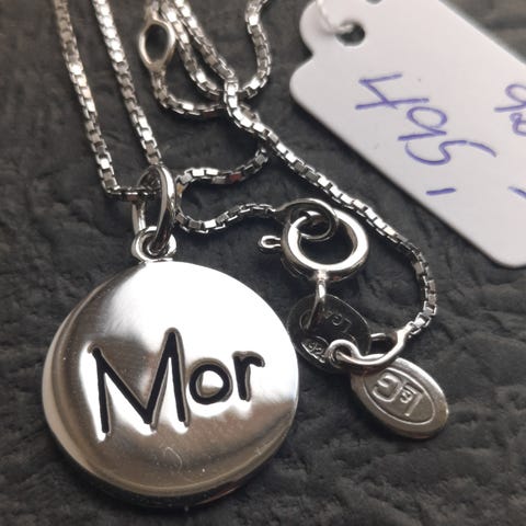 Smuk halskæde udført i blank Sterlingsølv med 2 vedhæng, vedhæng med motiv af et hjerte, rundt blankt vedhæng med teksten