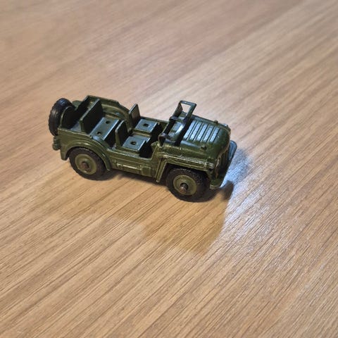Jeg sælger en original samlermodel Jeep Willys (Hotchkiss) fra det legendariske mærke Dinky Toys (Meccano). Det er en autentisk vintagemodel fra slutningen af 1950'erne, fremstillet i Frankrig.