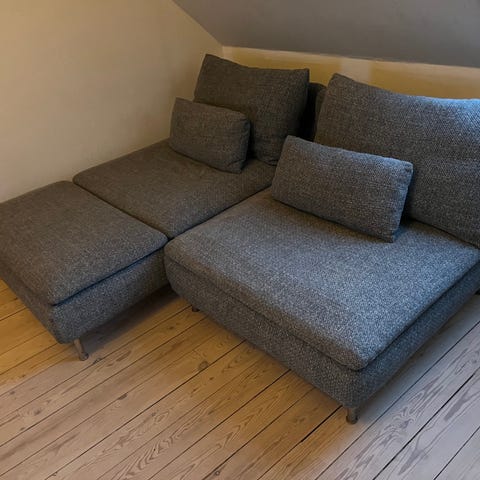 Sofa med chaiselong samt puf og åben ende i mellemgrå