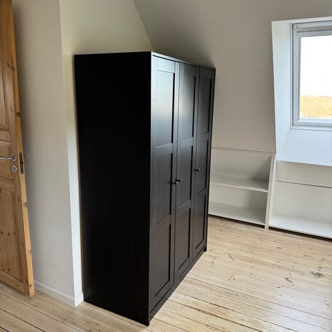 IKEA RAKKESTAD garderobeskab med bøjlestang og en hylde nederst. Farve sort, sortbrun.