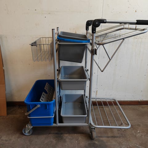 Mindre rengøringsvogn til prof. brug. Vi har et antal på 29 stk. inkl. de viste spande. Vognene er i rigtig god stand og kan tages i bruge uden yderligere.