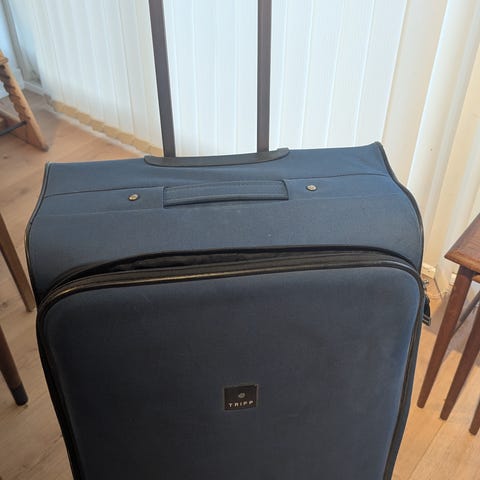 Stor og rummelig stofkuffert. Hjulet er gået i stykker, så den ruller ikke så godt. Ellers fejler den intet. Afhentes i København