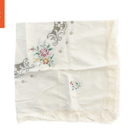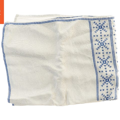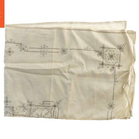 Dette er en borddug med målene 80x83 cm. Dugen har et flot broderi med blå mønstre langs kanterne og en blå frynset kant. Materialet virker let og har en lys grundtone med broderi, der tilføjer en dekorativ touch, ideel til brug på spisebordet eller som pynt.