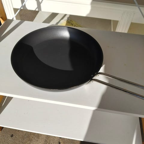En sort stegepande med en diameter på 29 cm. Panden har en belagt non-stick overflade og en solid håndtag for nem håndtering under madlavning. Den nederste del af panden viser tegn på brug med ridser og farveændringer, men er stadig funktionel. Mærket indikerer, at den er egnet til forskellige typer kogeplader, inklusive induktion. Tags: køkken, madlavning, nonstick.