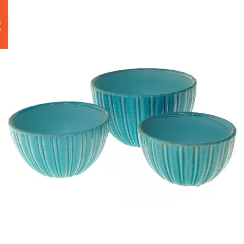 Dette er et sæt bestående af tre turkise skåle i forskellige størrelser. Skålenes topdiameter varierer fra 20 cm til 15 cm. De har en ribbet ydre tekstur og en glat indvendig overflade. Bunden af hver skål har label med information, som kan tyde på, at de kommer fra en bestemt producent eller butik. Skålene kan bruges til servering, opbevaring eller som dekoration i køkkenet.
