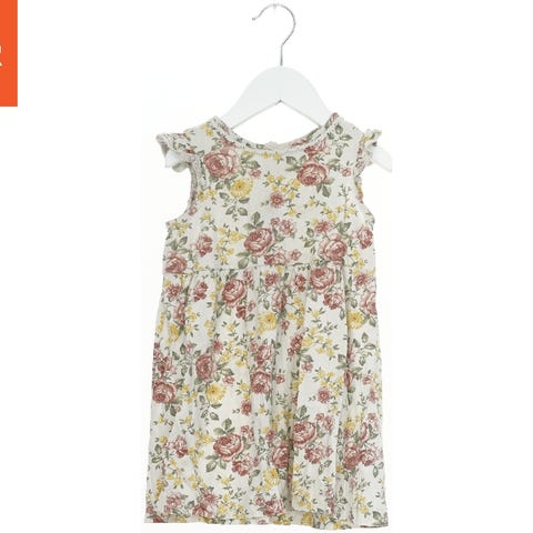 Kjolen har et blomstret design med store florale mønstre i beige, blå, grønne og hvide nuancer. Den har korte ærmer og elastisk talje, hvilket giver en lettere løs pasform. Materialet ser let og luftigt ud, perfekt til sommerbrug.