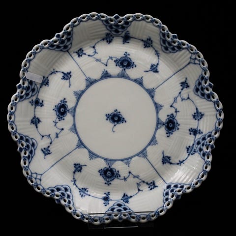 Royal Copenhagen helblonde musselmalet frugtkurv nr. 1061, IV sortering med tilhørende underfad nr. 1062, IV sortering.