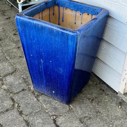 Blå keramik vase med sund plant