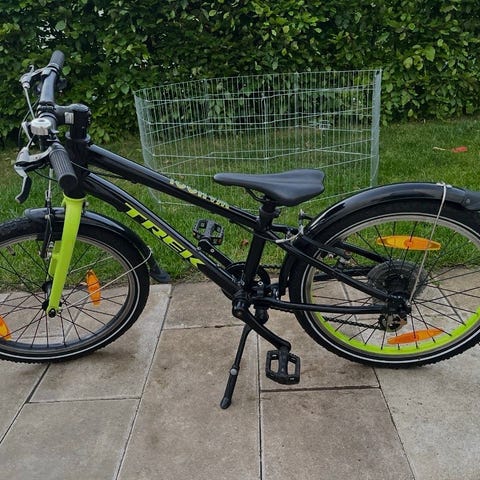 Trek børnecykel med 20" hjul i sort/rød. Cyklen har lige styr, håndbremser og gear betjent fra styret. Udstyret med skærme og støtteben. Velegnet som hverdagscykel til børn i den størrelse, der passer til 20" hjul.