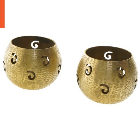 Disse unikke lysestager er lavet af messing og har en karakteristisk rund form med tre ben. De er designet til at holde stearinlys sikkert, og deres gyldne finish tilføjer et elegant touch til ethvert rum. Med en størrelse på 8 cm er de perfekte til mindre lys eller som dekorative elementer på en hylde eller et bord.