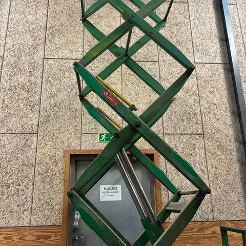 Hydraulisk sakselift med elektrisk 380 volt pumpe og fodbetjening. Løftebordet er udført med skridsikker plade på toppen og er beregnet til løft af emner op til 1000 kg, jf. mærkat på stellet. Konstruktionen består af kraftige stålprofiler i saksearmene og bundramme til fast montering i gulv. Egnet til værksted, lager eller andre arbejdspladser, hvor der er behov for at løfte og sænke tunge emner til en ergonomisk arbejdshøjde. Pladestørrelse: 80x130 cm. Løftehøjde: 18 til 130 cm. Liften bliver ledig 31. marts, men bestil den nu