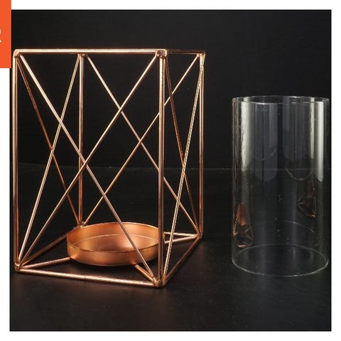 Objektet er en geometrisk lysestage lavet af metaltråd med en kobberfinish. Den har en trekantet form med en cirkulær holder til stearinlyset på toppen. Designet er enkelt og moderne, og størrelsen er 15x15x10 cm.