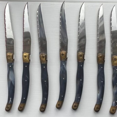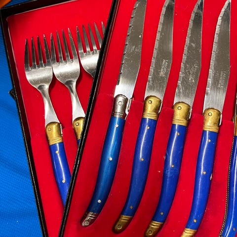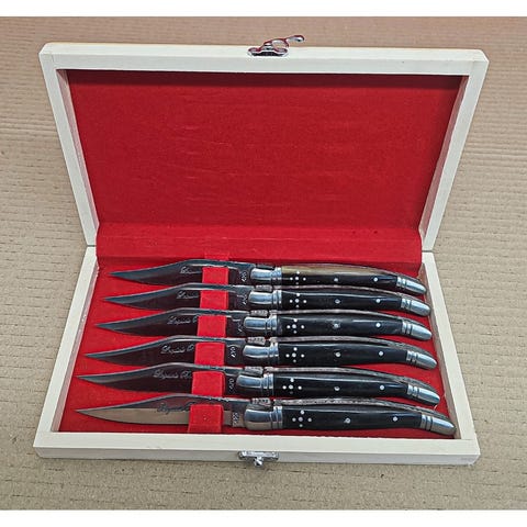 Laguiole bestiksæt med sorte skæfter. Sættet indeholder steakknive, gafler samt serveringsdele som salatbestik og kødgaffel.