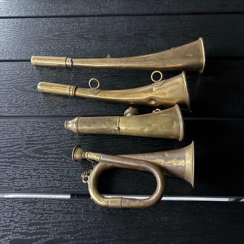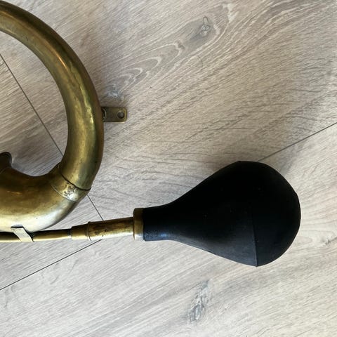 Horn i messing med gummiblære. Klassisk cars eller signalhorn, hvor lyden frembringes ved at klemme på gummiblæren. Velegnet som pynt, rekvisit eller til brug på cykel eller køretøj, hvor der ønskes et mekanisk signalhorn.