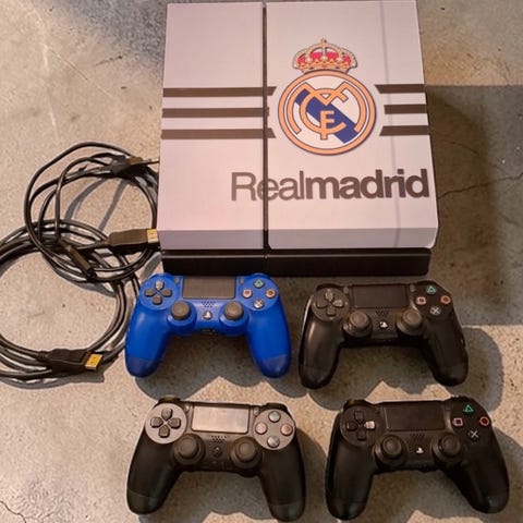 Sony Playstation 4 konsol med to controllere i forskellige farver. Flere spil medfølger