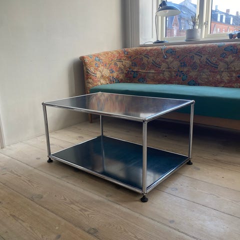 USM Haller er kendt for sin høje kvalitet, modulopbyggede konstruktion og tidløse design. Dette bord har det karakteristiske forkromede rørstel og samlekugler, som giver det elegante og industrielle look.