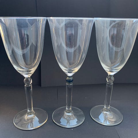 6 vinglas med skæv stilk. Det var nogle man kunne samle når man købte en vin af samme navn. Flaskehalsen var også skæv.