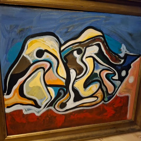 Maleri med abstrakt, figurativt motiv i mørke nuancer med blandt andet grøn, rød, sort og hvid. Billedet er indrammet i en gul træramme med dekorative malede detaljer langs kanten. Motivet fremstår ekspressivt med flere ansigtslignende former og organiske linjer. Velegnet som vægdekoration i stue, gang eller kontor. Kunstner og præcise mål fremgår ikke af oplysningerne.