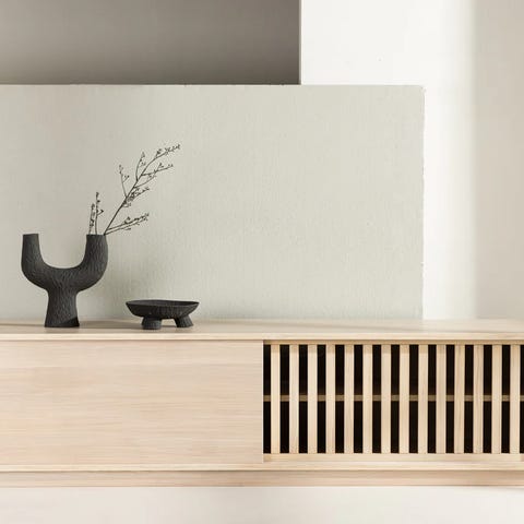 Vogue sort mediebænk fra Decotique med en ramme med tre skydedøre i samme farve og seks ben med en 18,5 cm højde. 180 cm i længde.