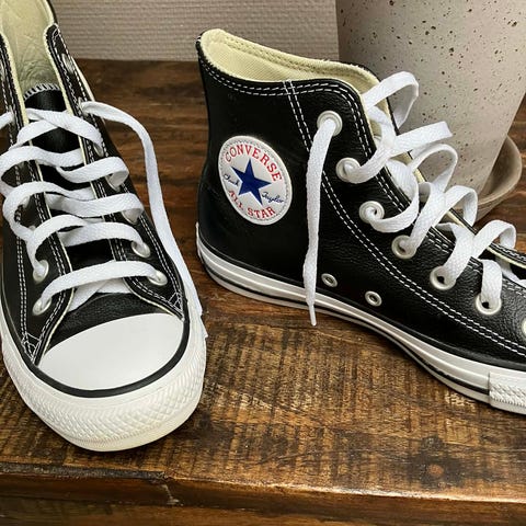 Converse sneakers i størrelse 38 (7) af smukt brunt læder. Skoene har klassisk højt design med hvide snørebånd og gummisål. Velegnede til dagligt brug.