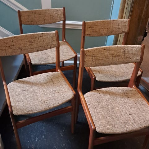 4 smukke Savbukkestole med stel i massiv egetræ og ryg i fineret teak. Polstring er udskiftet af tidligere ejer.