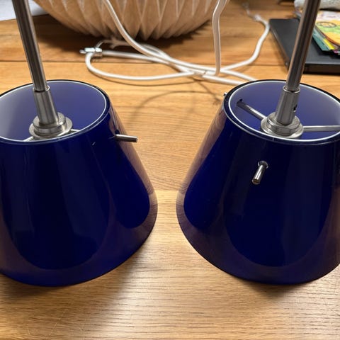 2 stk. blå glaslamper. Vurderet til at være designet af Michael Bang. Lamperne er fra tidsrummet ca. år 1960