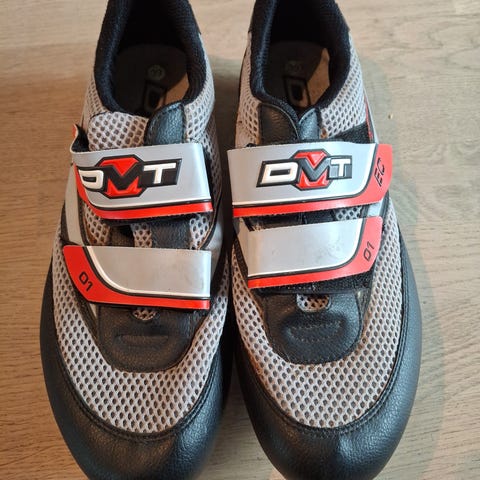 DMT cykelsko i størrelse 46 i gul/sort farve. Skoen har spænder og drejelukning for justering af pasform. Undersålen er forberedt til montering af klamper til klikpedaler. Velegnet til landevejscykling eller træning på cykel, hvor der anvendes kliksko. Cykelhjelm på billederne er i matchende gul/sort design med ventilationshuller og justerbar rem.