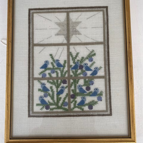 Smukt julebroderi med 60+ år på væggen. I lys træramme der er alders patineret (mørkere). Glas i rammen. Mål 22 x 27 cm. Kan sendes på købers regning til pakkeshop for 45 kr. (DAO eller GLS).