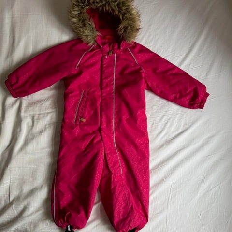 Fantastisk varm flyverdragt/overall af høj kvalitet fra Reima. Hætten har en flot fuskpels og kan tages af. Farven er blevet en smule slidt nogle steder som på knæne, men er ellers i god stand. Jeg kan evt. sende eller den kan hentes på Østerbro eller København K.
