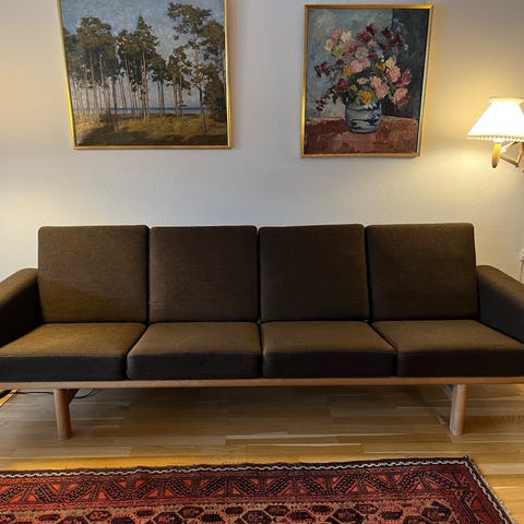 Hans J. Wegner 2-personers sofa med massiv træramme og mønstret polsterbetræk. Sofaen har løse sæde- og ryghynder samt synlig træryg med lamelkonstruktion under sæderne. Velegnet som mindre sofa til stue eller opholdsrum, hvor der ønskes klassisk dansk design med synlig træstruktur og polstrede hynder. Kom med et bud tror den hedder GE40