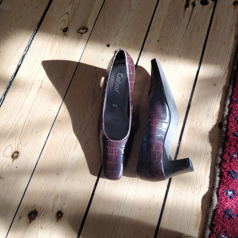 Dame skind sko af mærket Gabor med en elegant flæse kant i læder rundt i åbningen som ender i en sløjfe 5,5 cm høj hæl. Brugt 2 gange