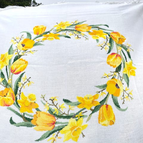 Påskedug, Håndbroderet dug til påskebordet, Smuk dug til påskebordet. Håndbroderet og i super stand. På sidste billede kan man se de hæftede tråde.